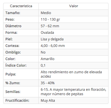 De fructificación muy alta. Se inicia la recolección estando verdoso, cuando alcanza el tamaño y porcentaje en zumo de limón suficientes. Se recupera mejor de las heladas que el Verna y se adpata mejor a diferentes tipos de suelo.