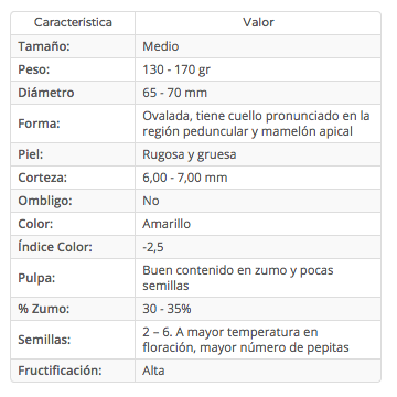 El fruto es de buen tamaño, superior al Fino, con un mamelón grande en la zona apical y un cuello en la zona peduncular. Tiene pocas semillas. A mayor temperatura en floración, presenta mayor número de semillas. Forma ovalada. La corteza es algo rugosa y gruesa, y la pulpa tiene muy buen contenido en zumo.