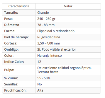 La riqueza del contenido en zumo de naranja es de baja acidez y elevada concentración de azúcares, siendo el porcentaje de sólidos disueltos, ácidos totales e Índice de Madurez, muy similares al de la Washington Navel, aunque de mayor tamaño. Presenta una mayor adherencia al pedúnculo y mayor firmeza. Tiene el inconveniente de que la textura de la pulpa es basta (recuerda a la Thomson Navel) debido a que las paredes de las vesículas de zumo son duras.